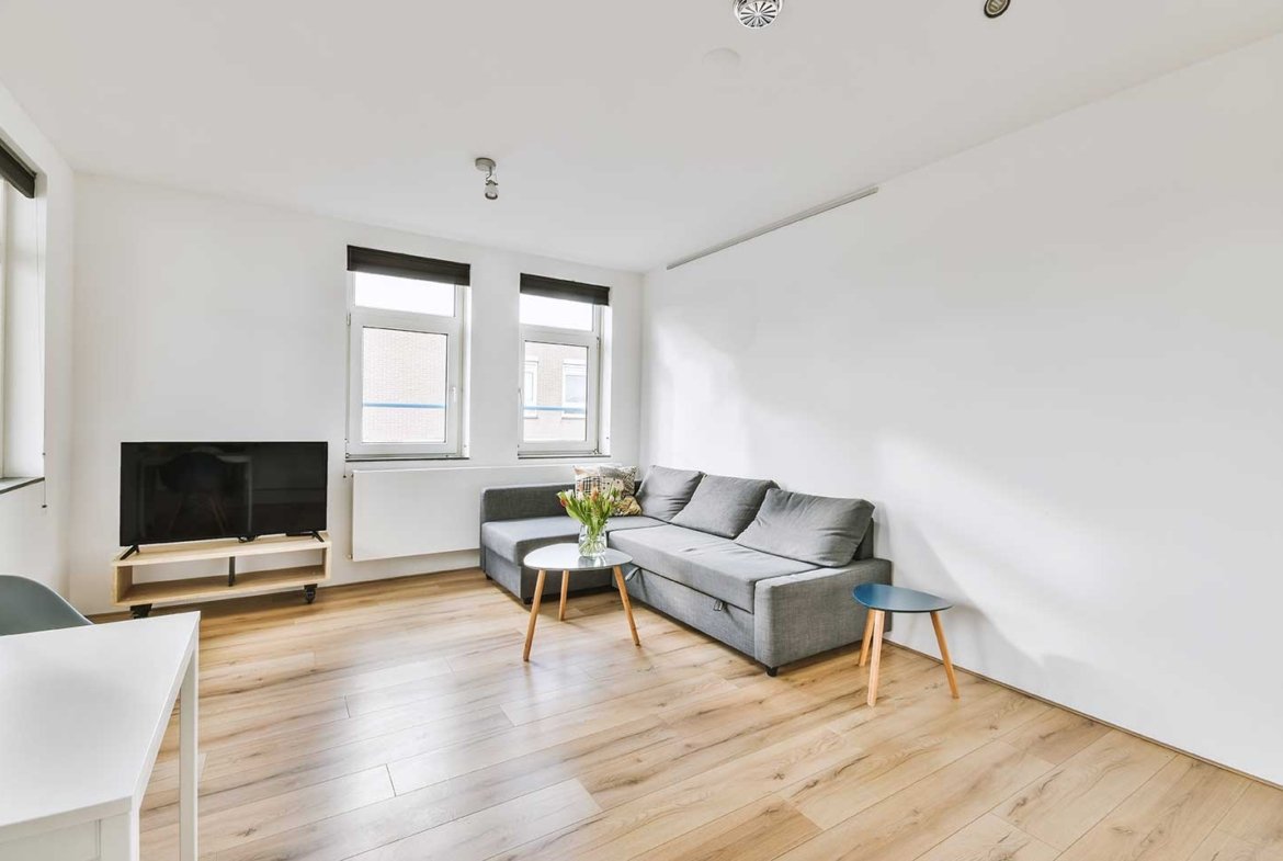 The apartment features a bright living room with large windows, a fully equipped modern kitchen, and spacious bedrooms for maximum comfort.